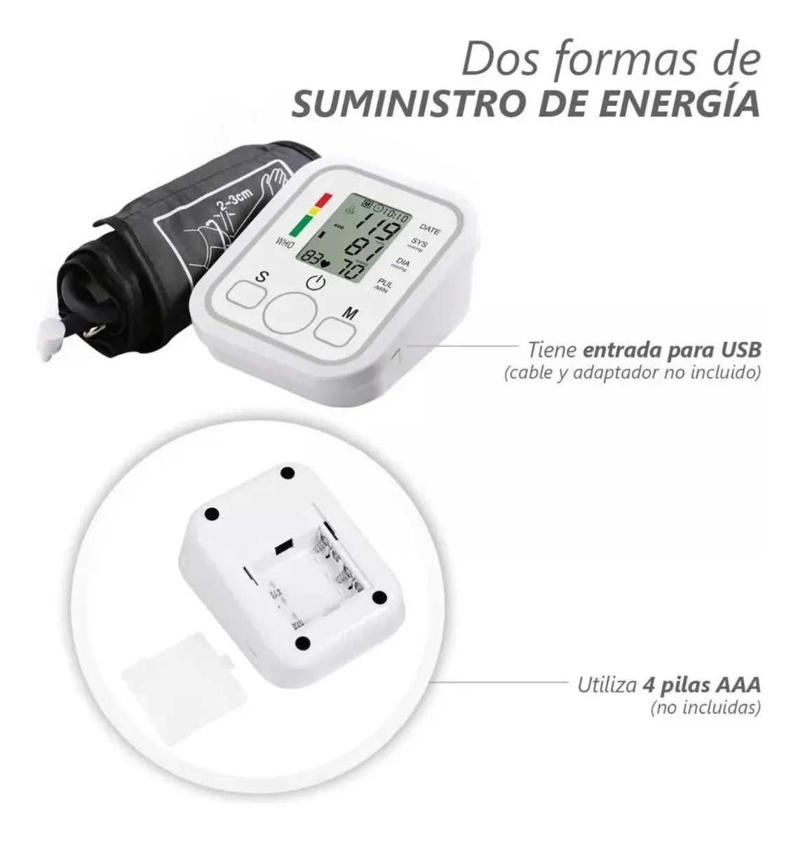 Solo en 1‑2 minutos tendrás tus niveles de presión y saturación. Sin hacer filas ni depender de horarios. Lleva el control donde estés: el kit te acompaña con carga USB o pilas, según lo que necesites.